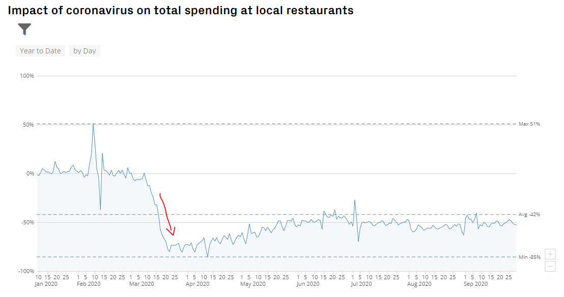 If you look at the total spending on local restaurants above, you'd be able to see the real picture. The spending on local restaurants has reduced more than 70% due to the pandemic.
